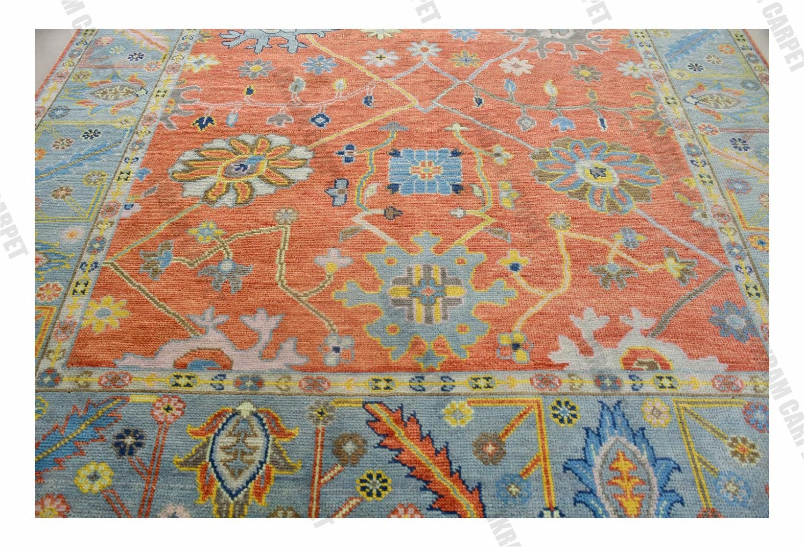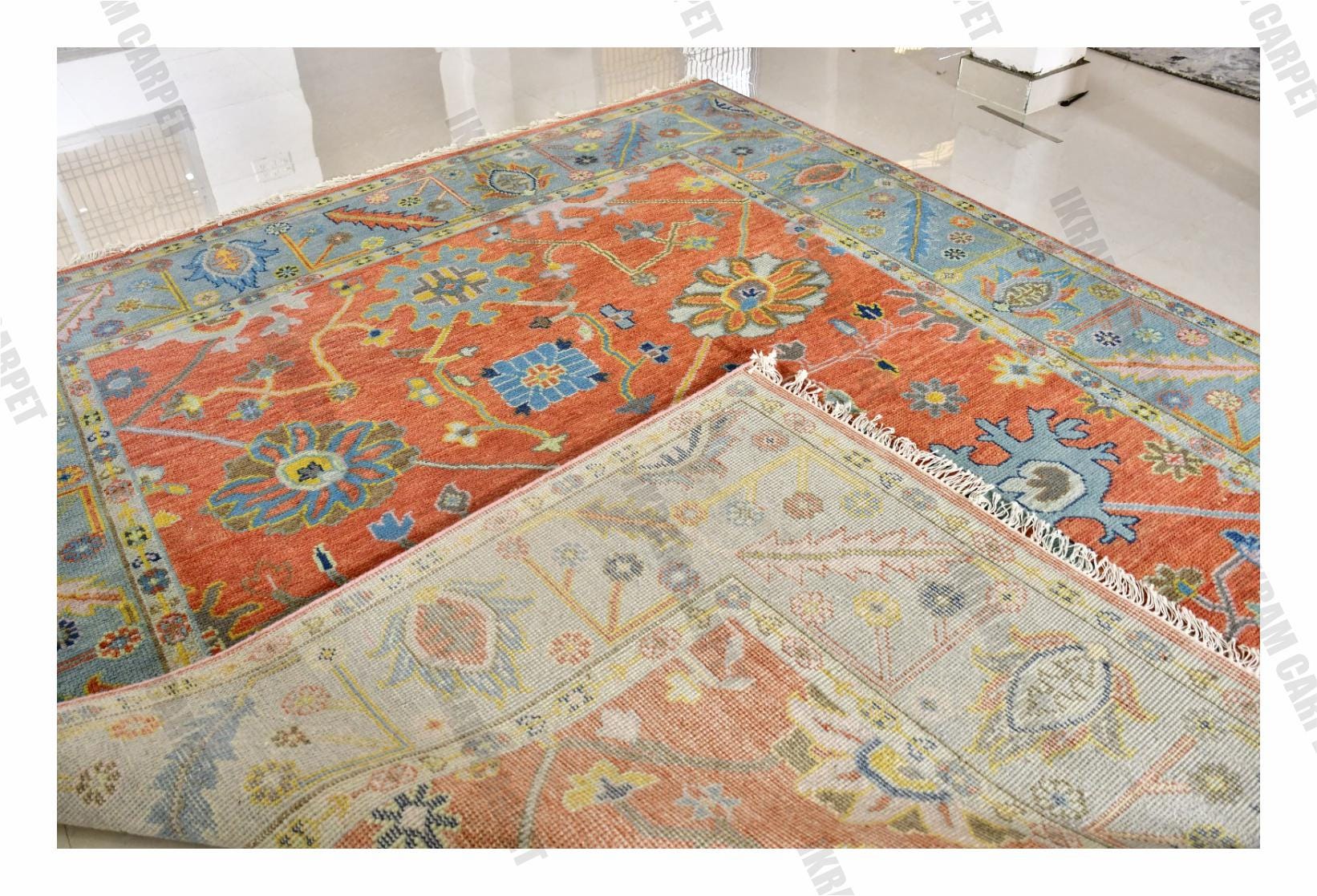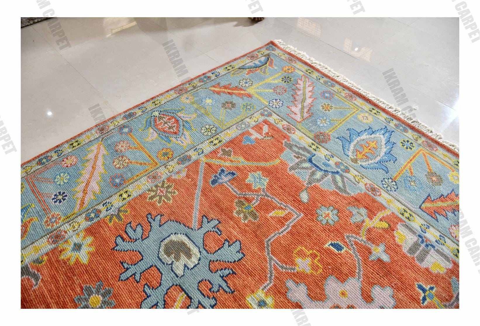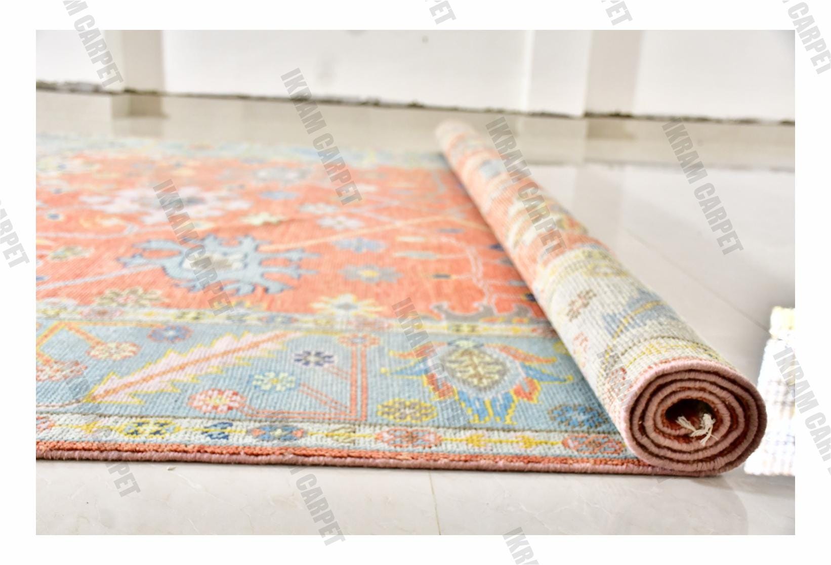 Hand-knotted Turkish Oushak rug in burnt orange with accents of blue, yellow, green, red, white, pink, and beige — available in 8x10, 9x12, 10x14, and all custom sizes. Crafted from premium New Zealand wool, this rug offers a warm pastel foundation with subtle, lively hues that bring character and timeless charm to any room.