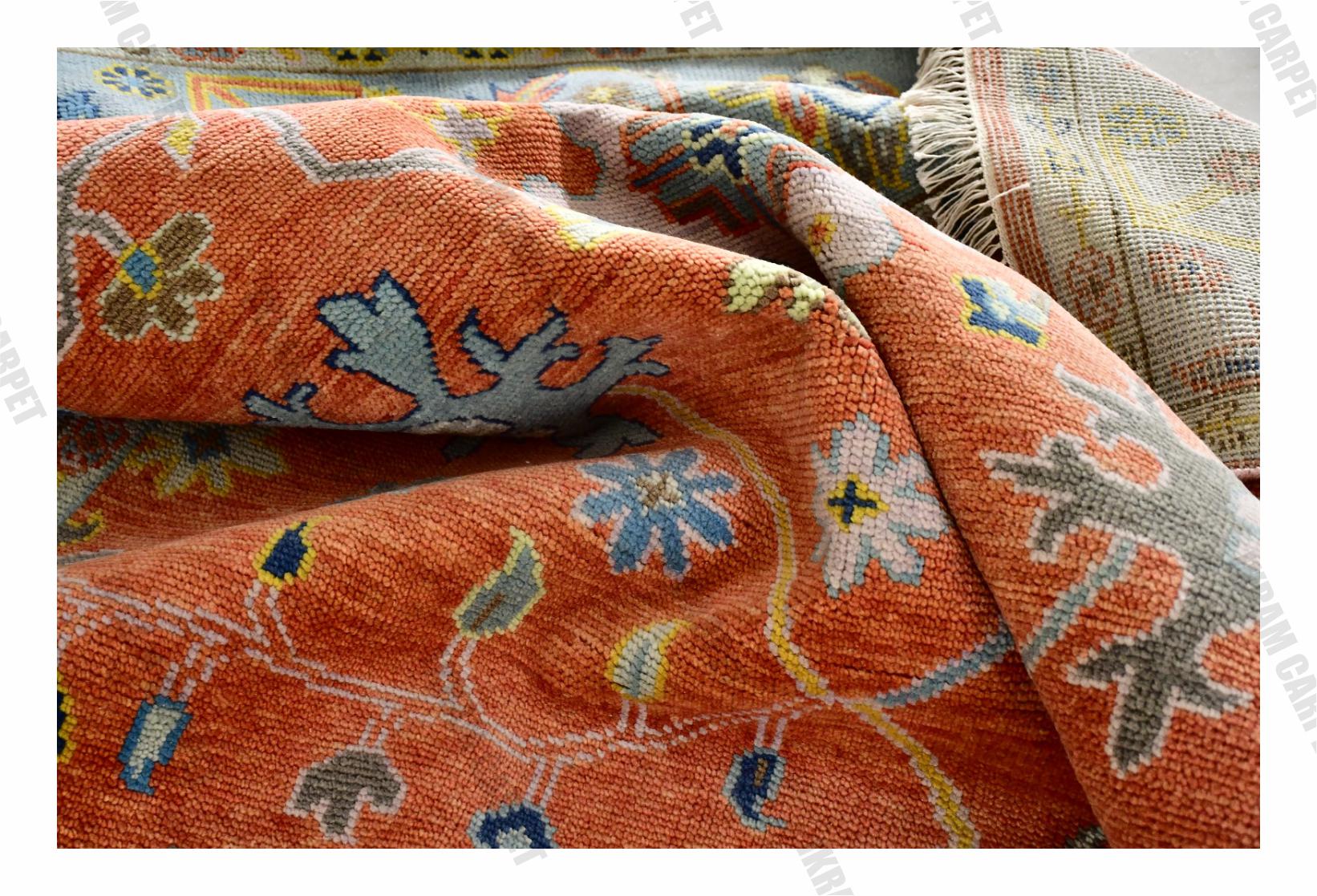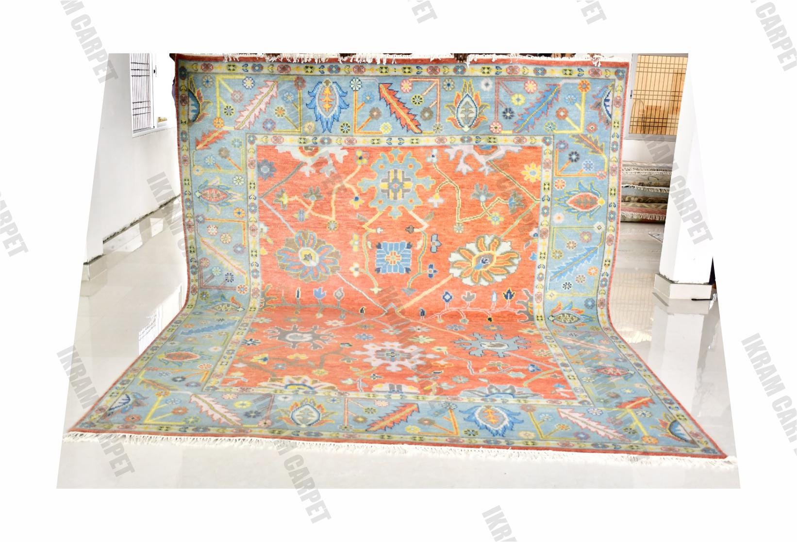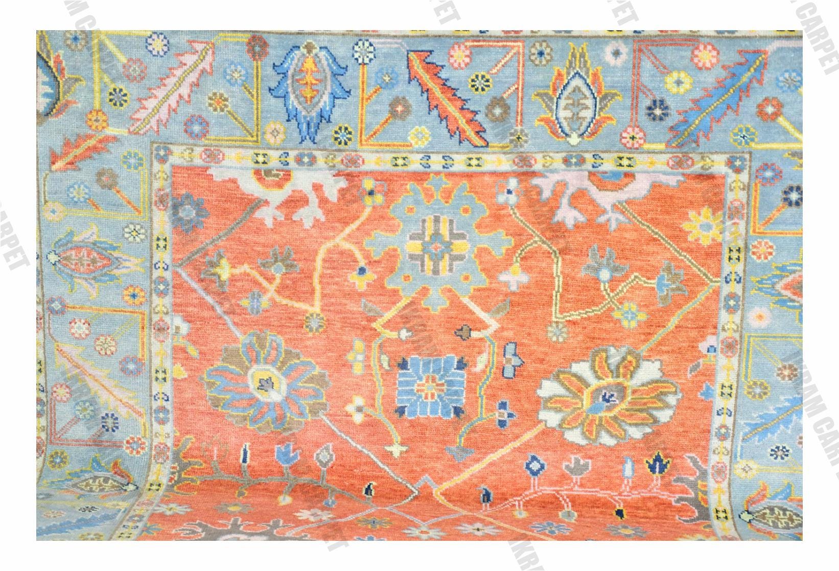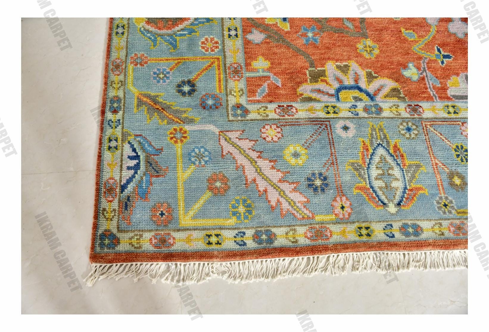 Hand-knotted Turkish Oushak rug in burnt orange with accents of blue, yellow, green, red, white, pink, and beige — available in 8x10, 9x12, 10x14, and all custom sizes. Crafted from premium New Zealand wool, this rug offers a warm pastel foundation with subtle, lively hues that bring character and timeless charm to any room.