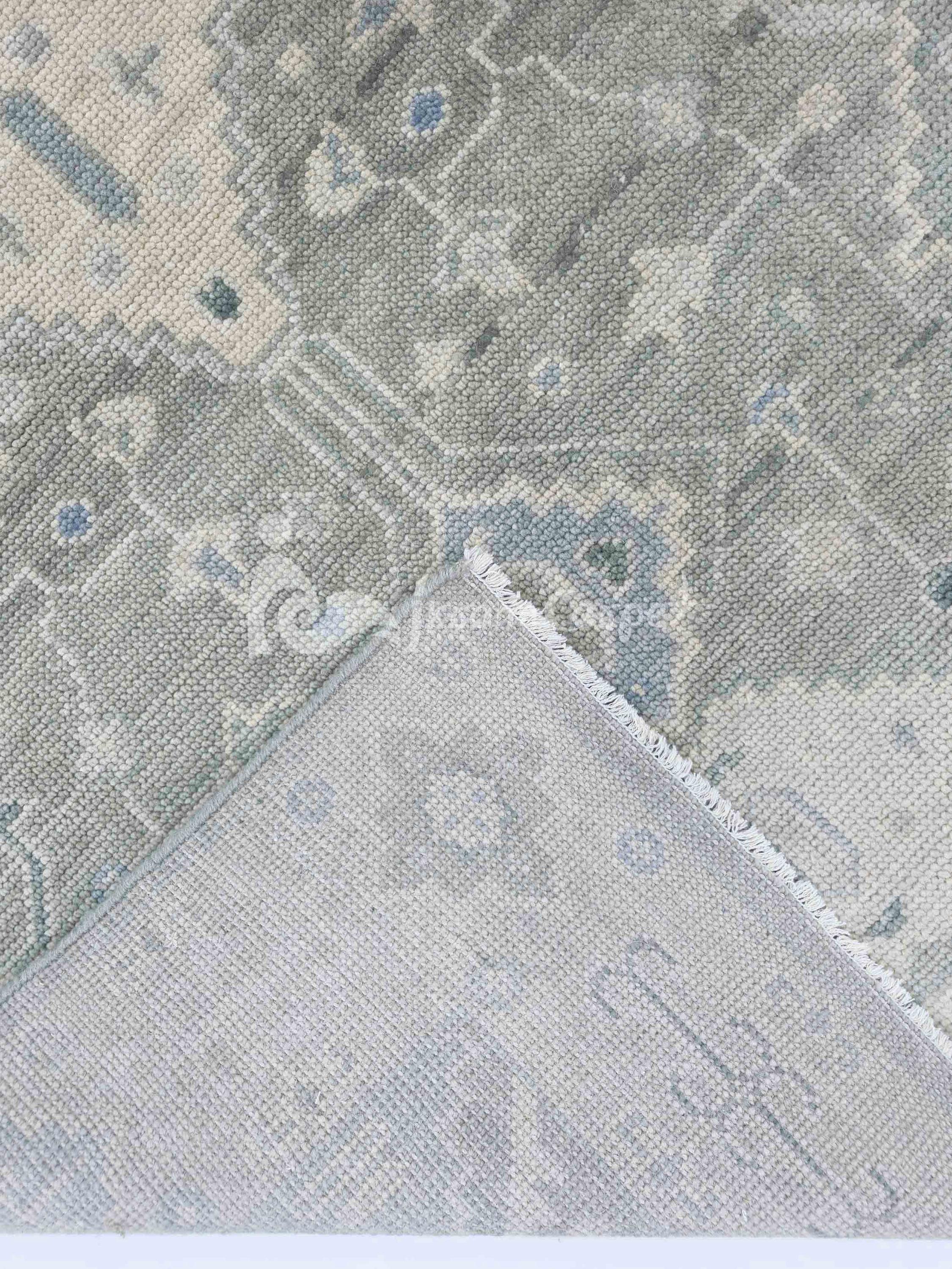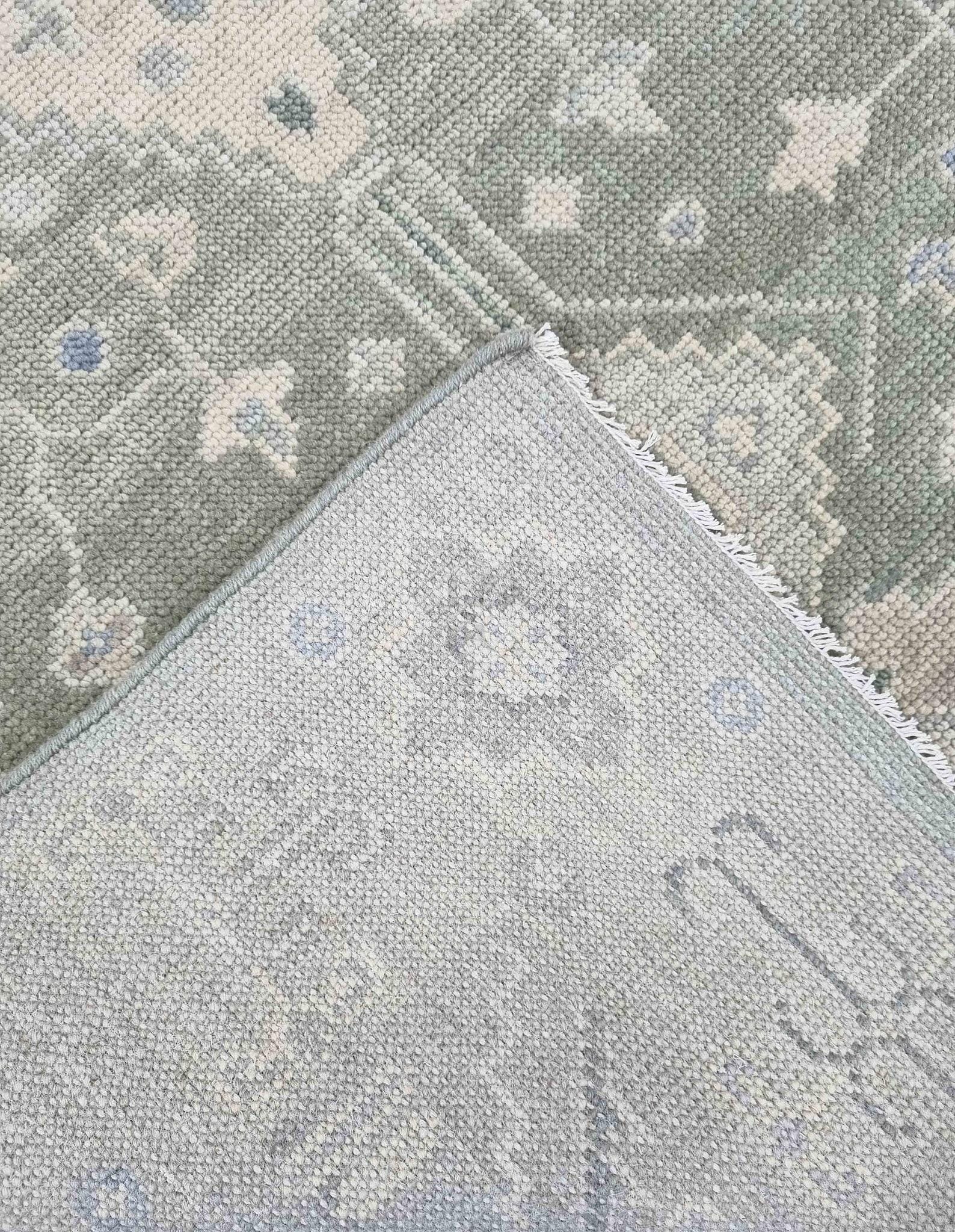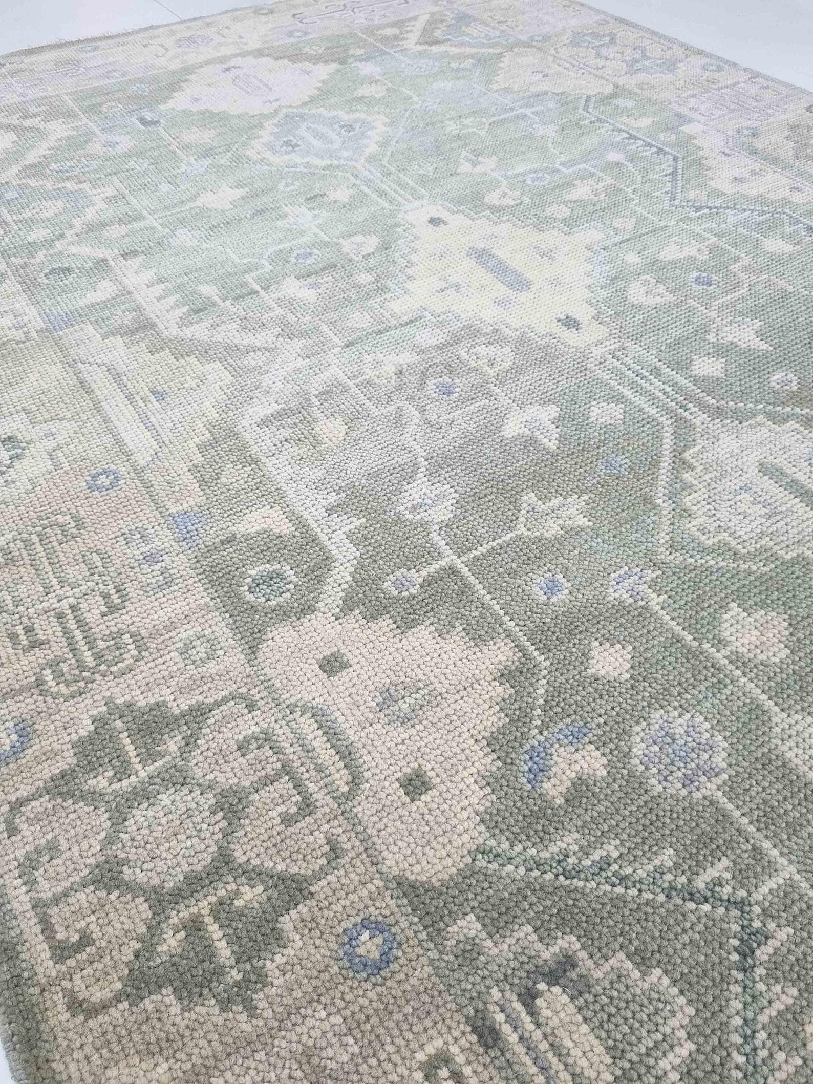 Hand-knotted Turkish Oushak rug in sage green, light gray, soft blue, ivory, and taupe accents — available in 9x12 and all custom sizes. Crafted from premium New Zealand wool, this rug captures timeless Turkish artistry with a modern, muted palette that complements both classic and contemporary interiors.