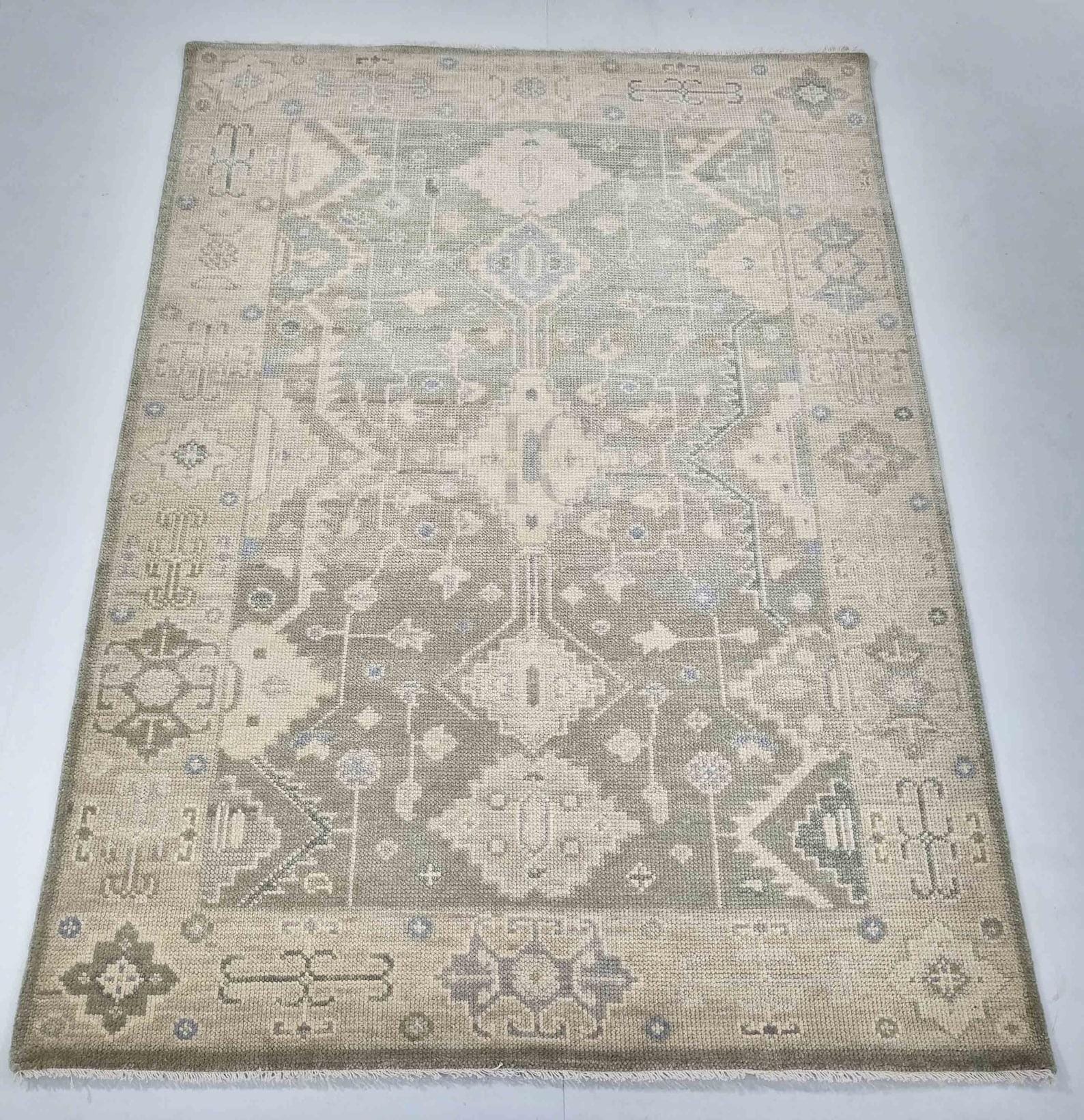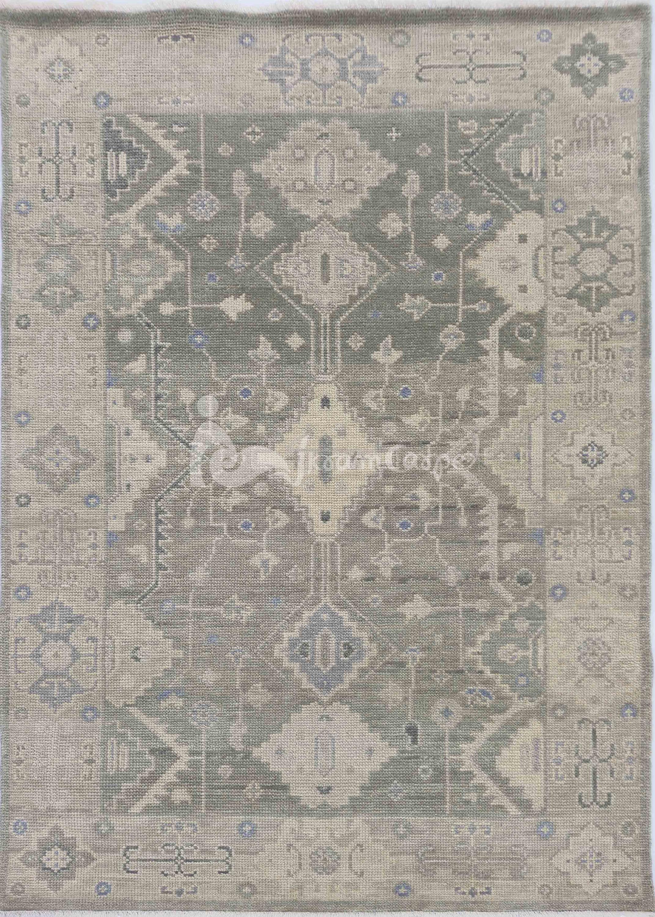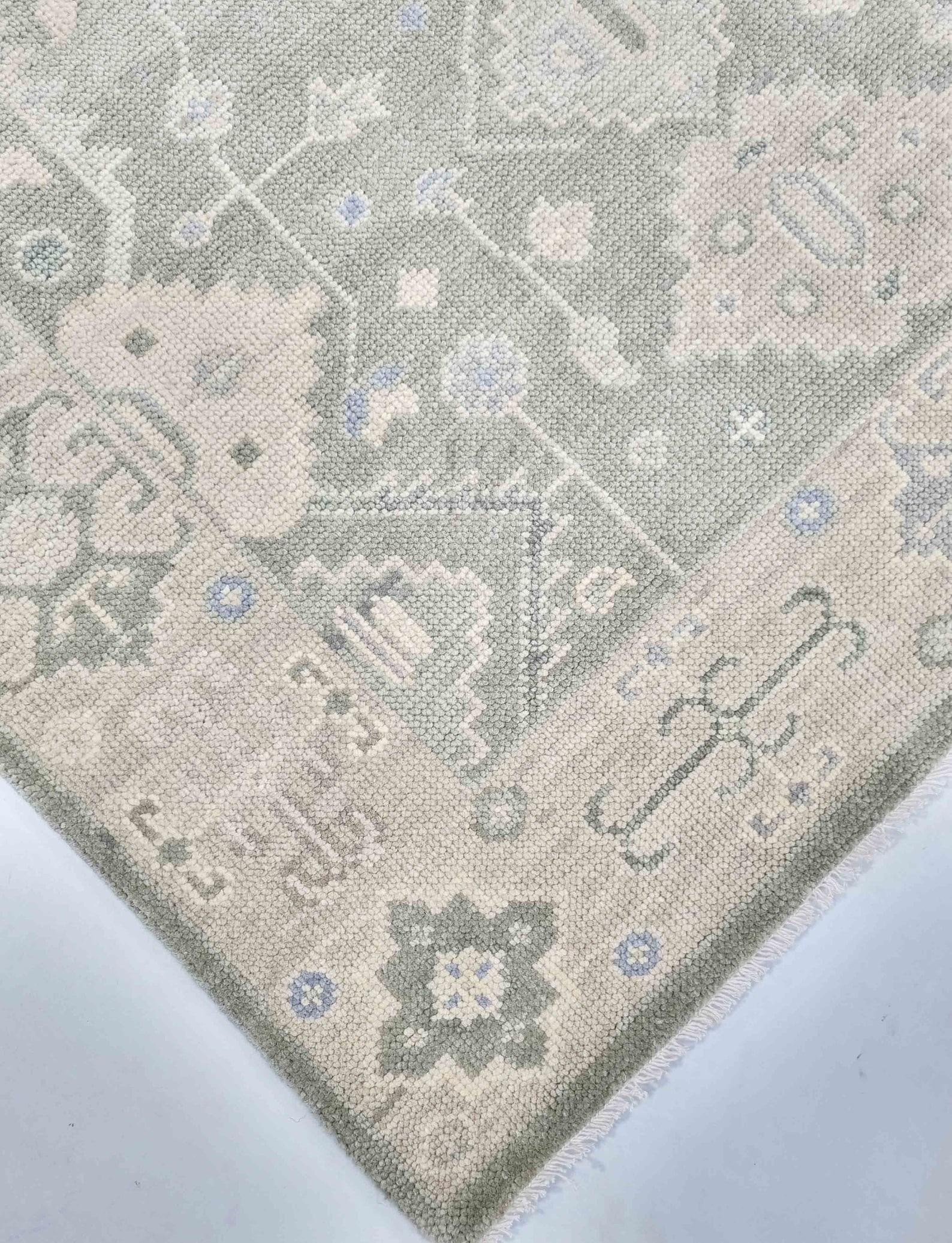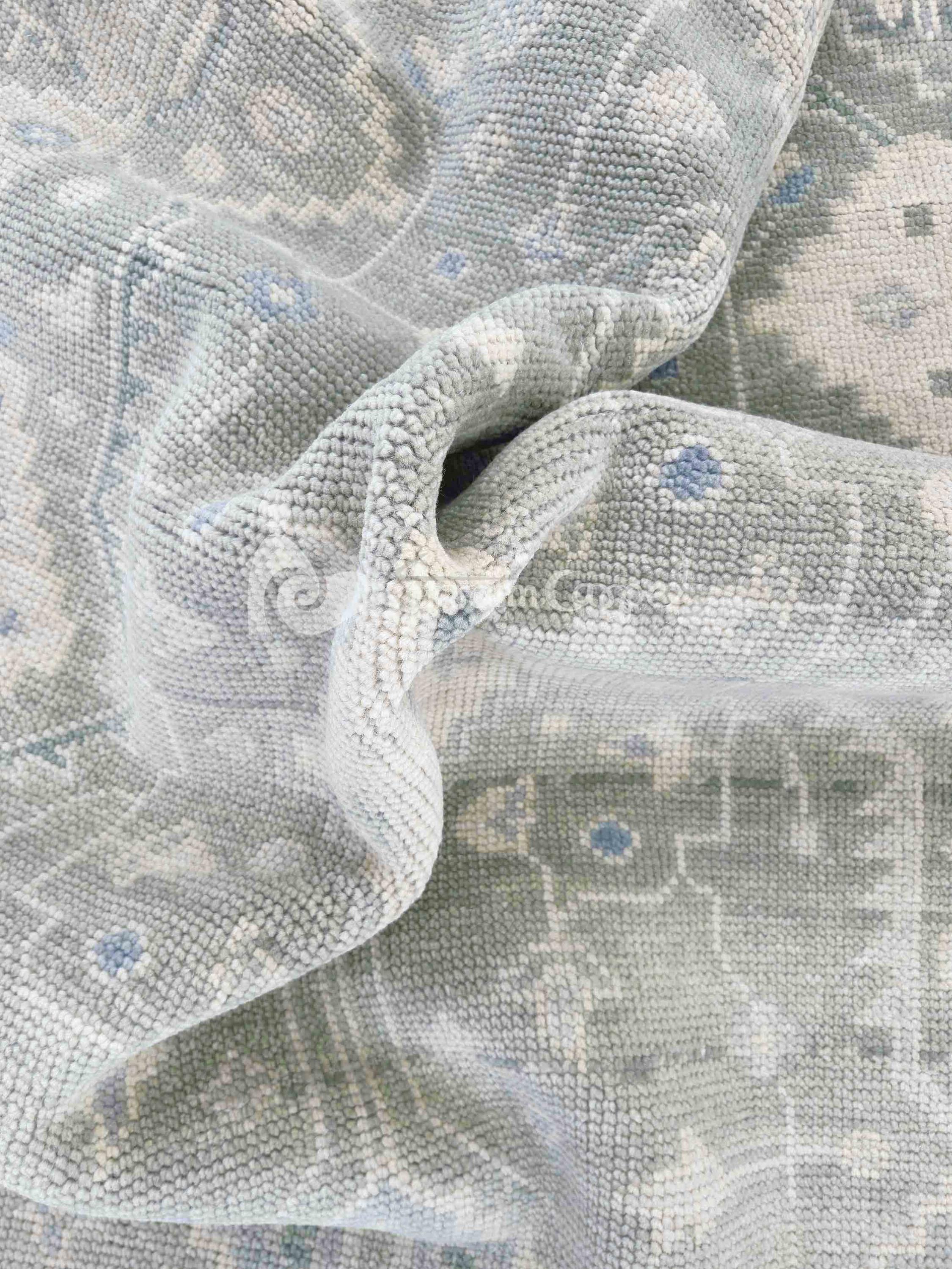 Hand-knotted Turkish Oushak rug in sage green, light gray, soft blue, ivory, and taupe accents — available in 9x12 and all custom sizes. Crafted from premium New Zealand wool, this rug captures timeless Turkish artistry with a modern, muted palette that complements both classic and contemporary interiors.