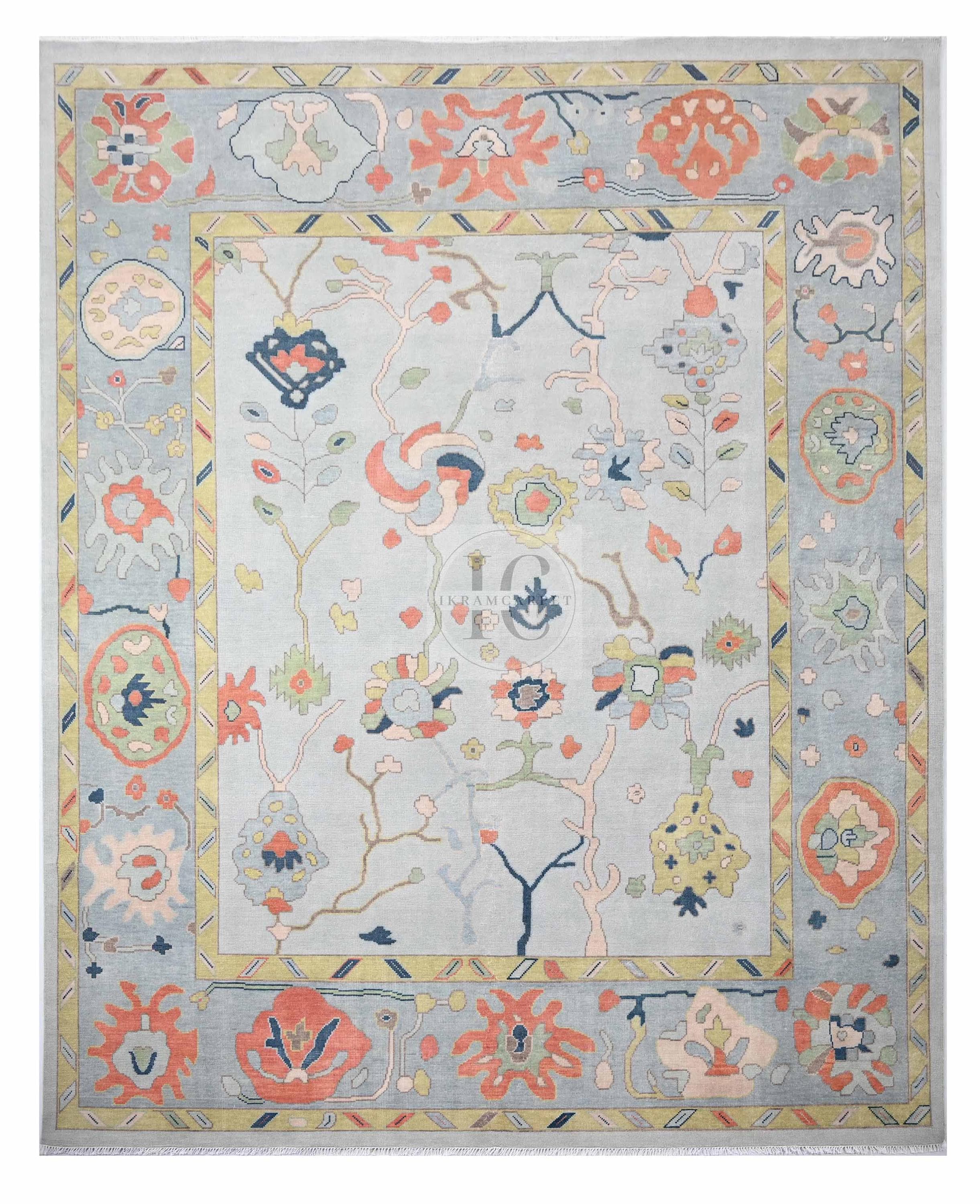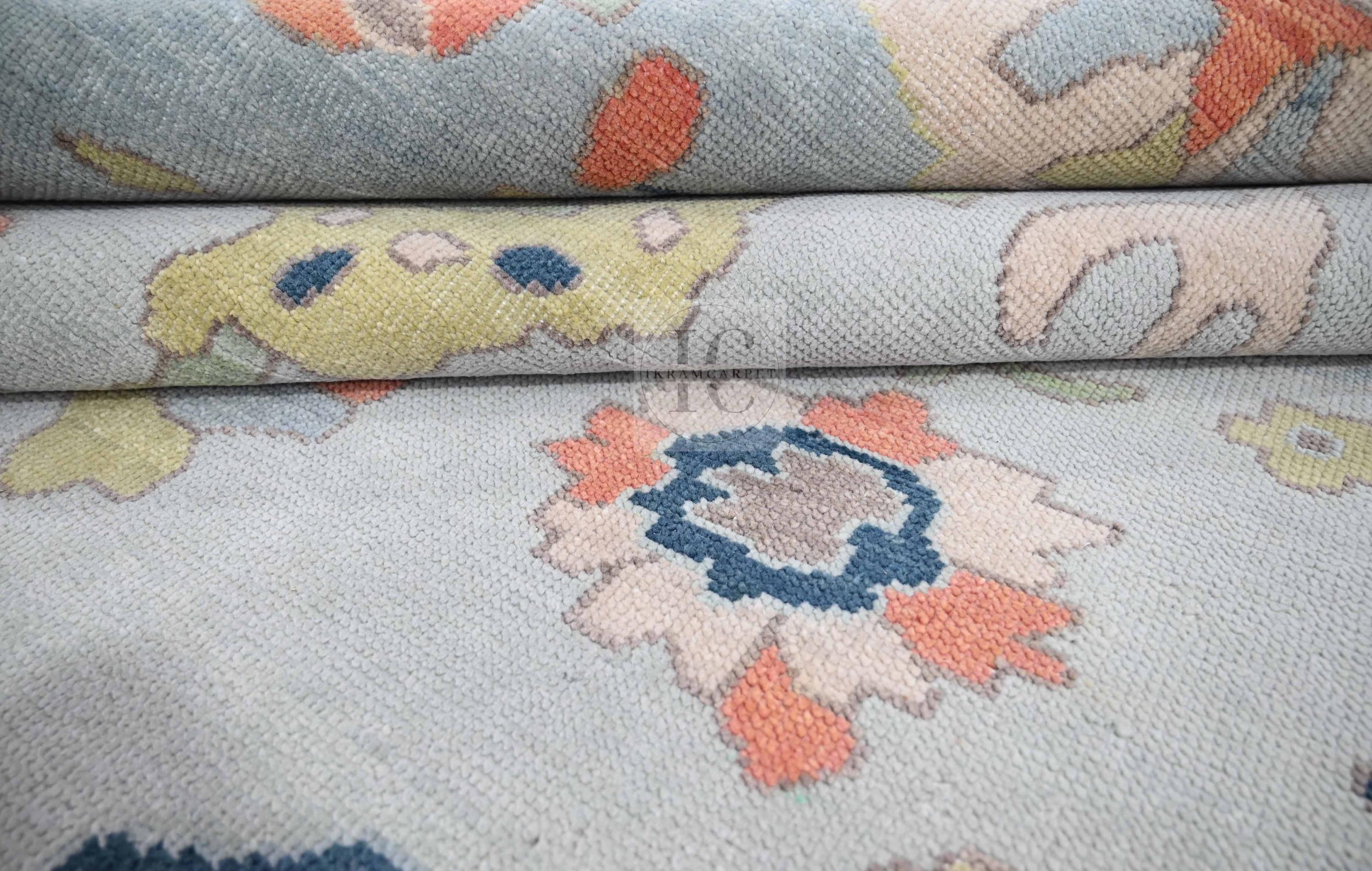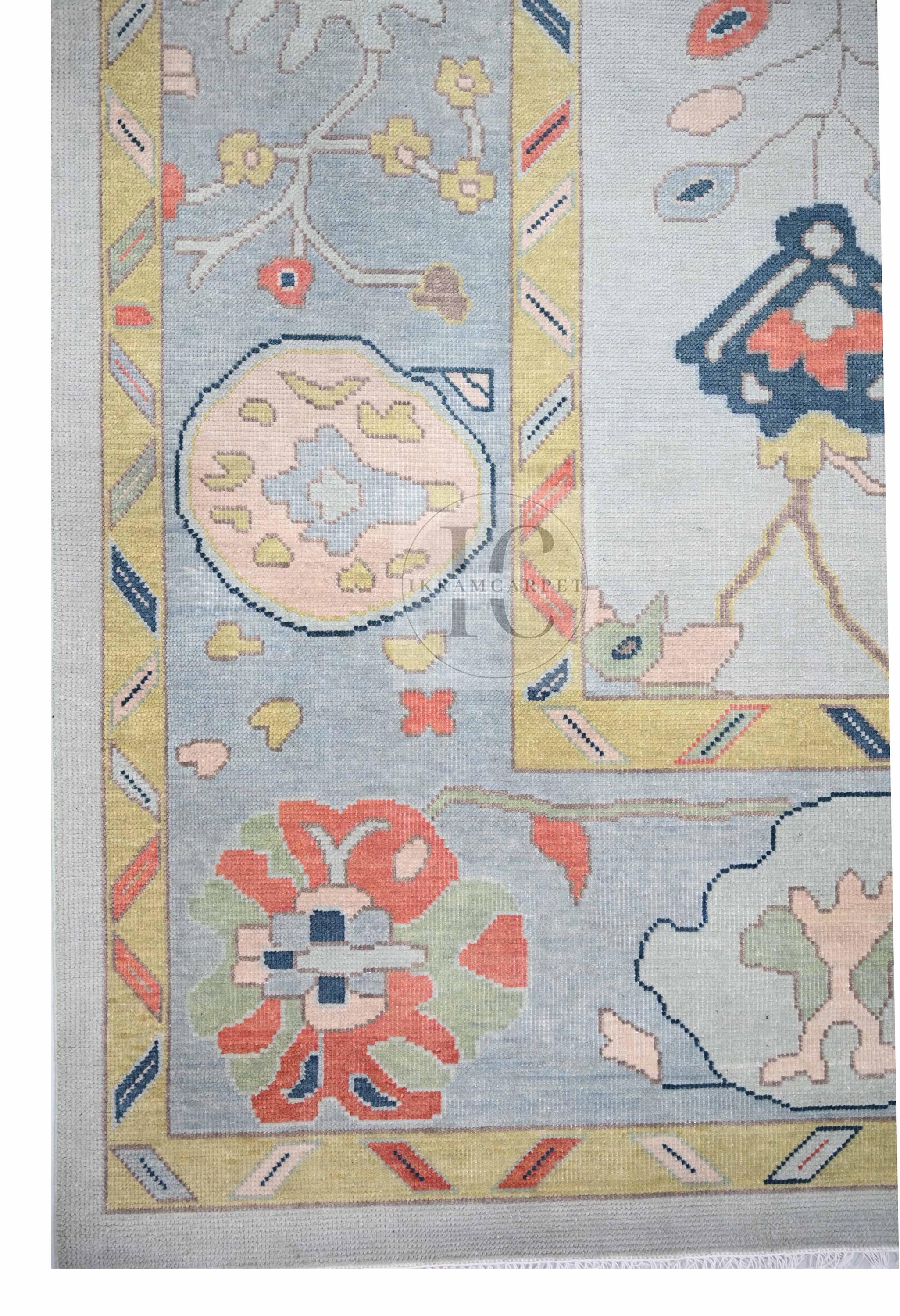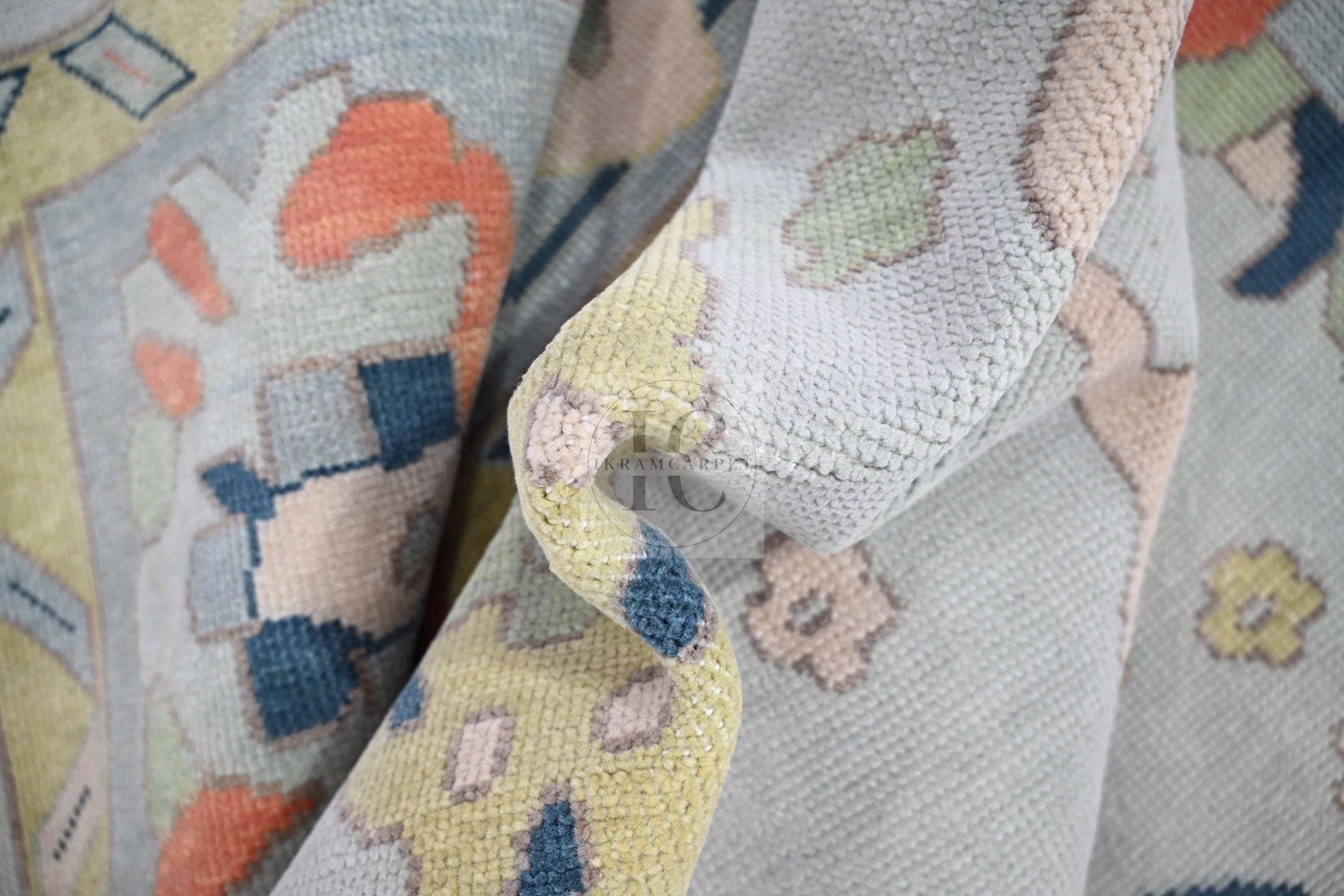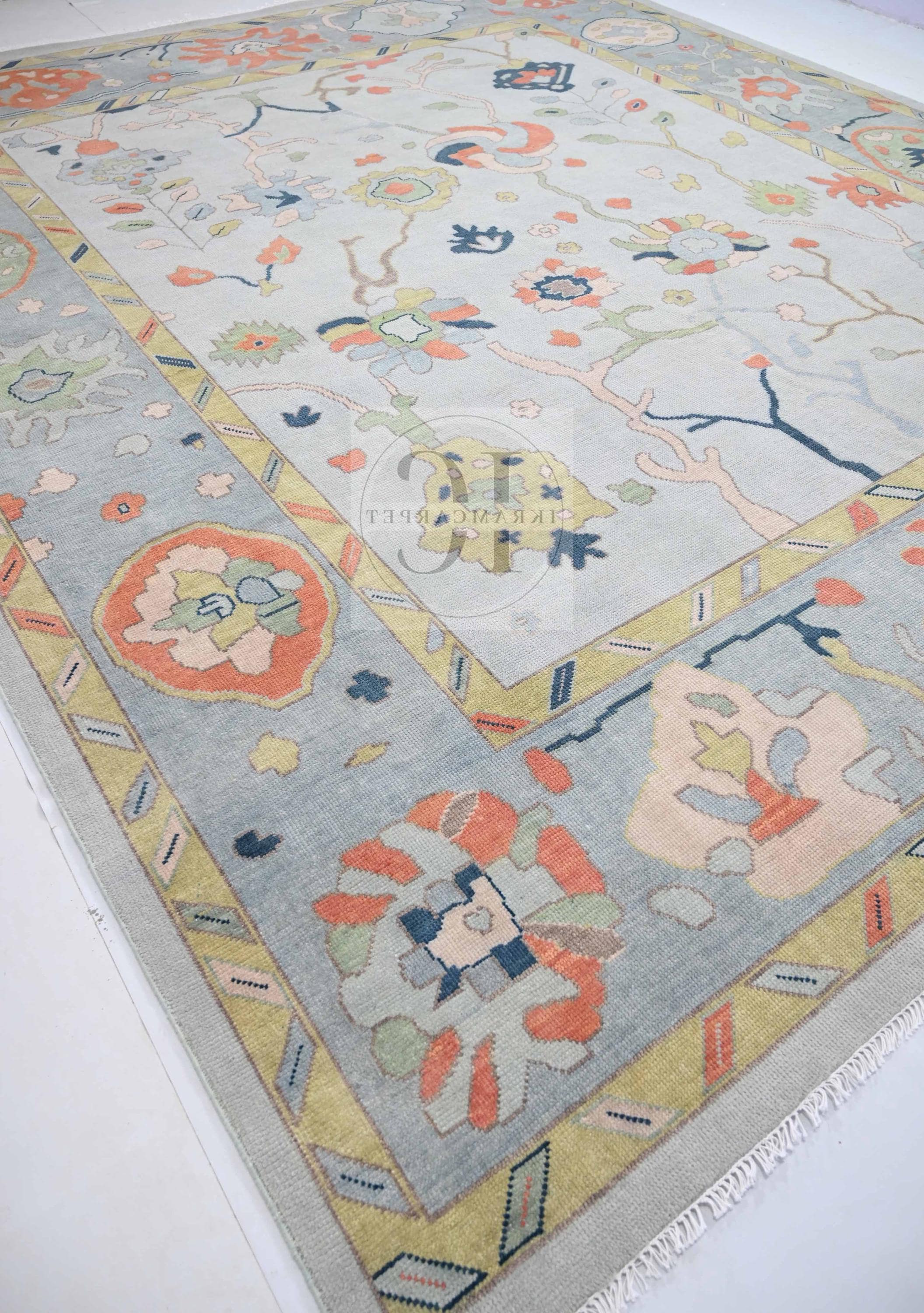 Hand-knotted Turkish Oushak rug in light gray, coral, soft yellow, light blue, and beige tones β€” available in 9x12 and all custom sizes. Crafted from premium New Zealand wool, this rug offers vibrant artistry with timeless charm, making it a statement piece for modern and classic interiors.