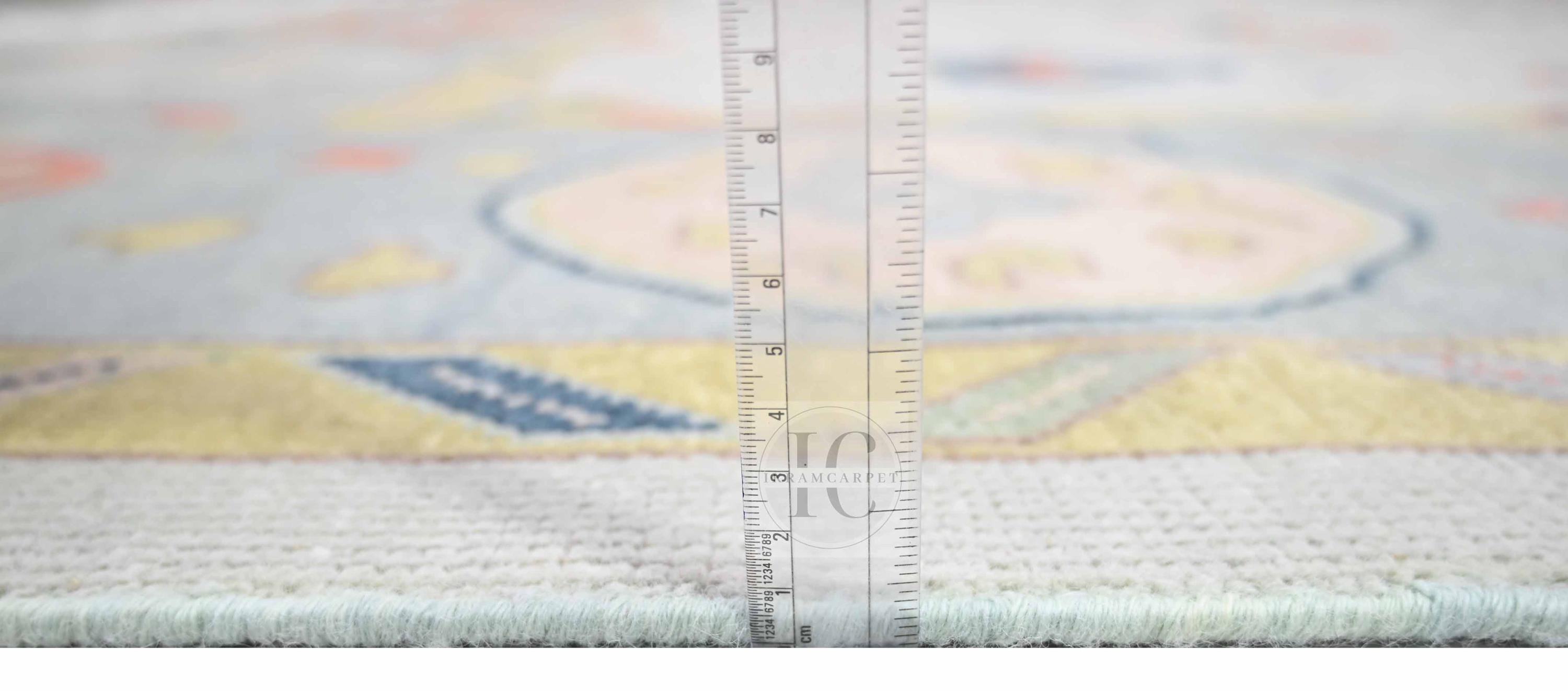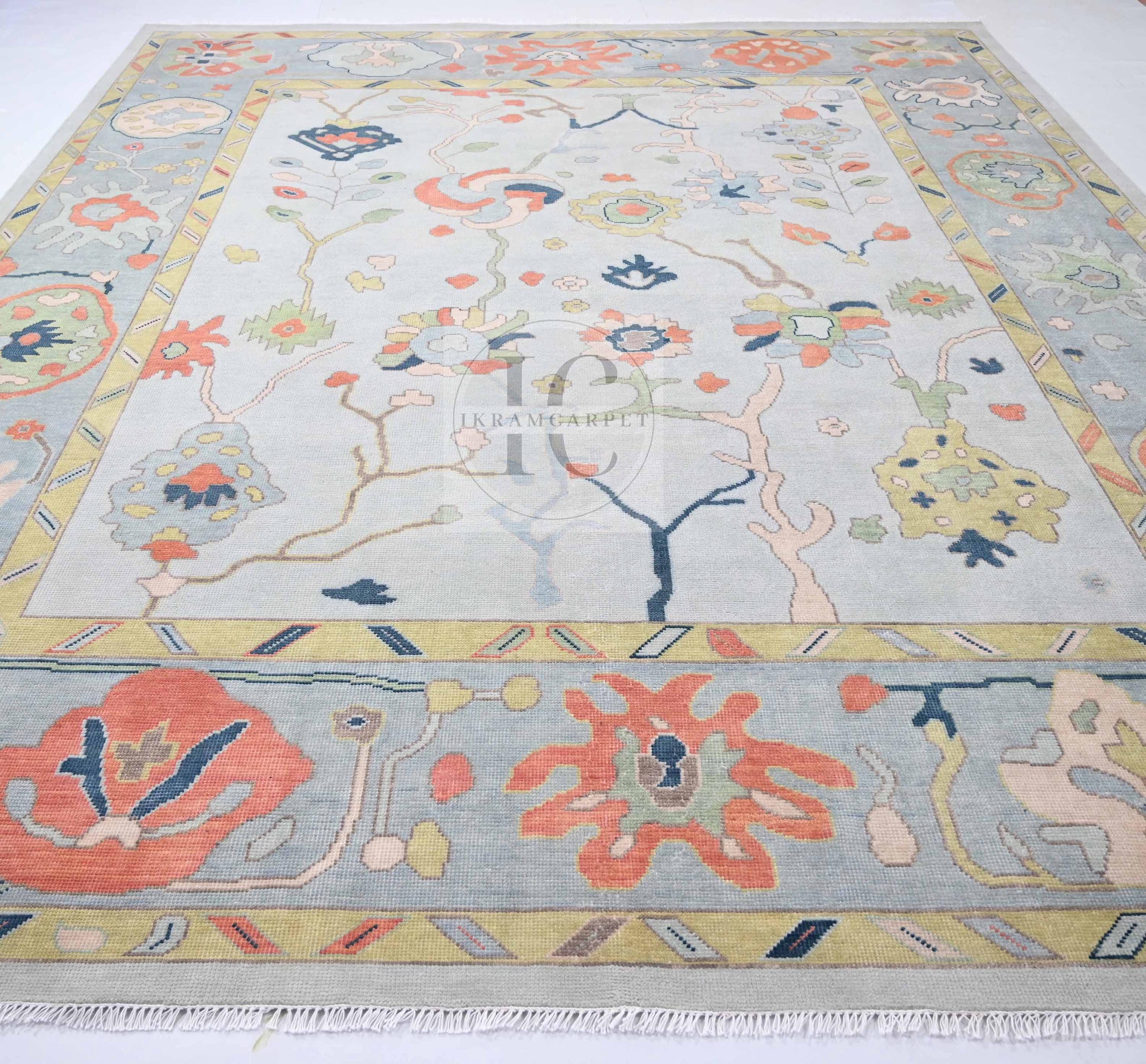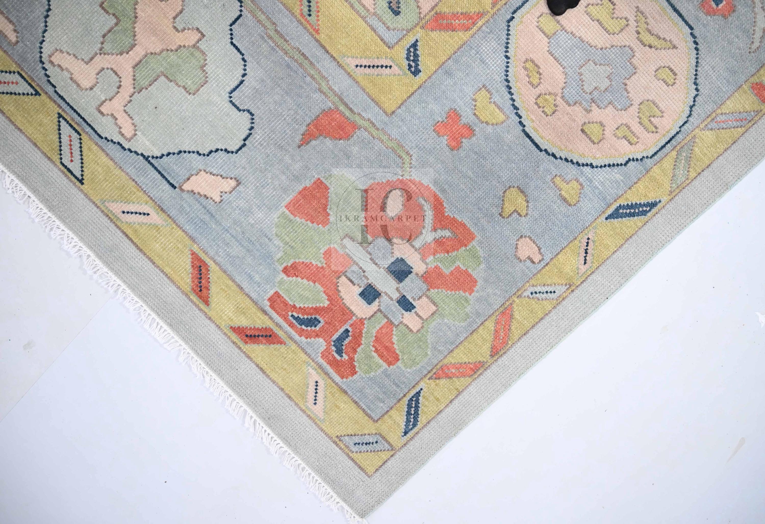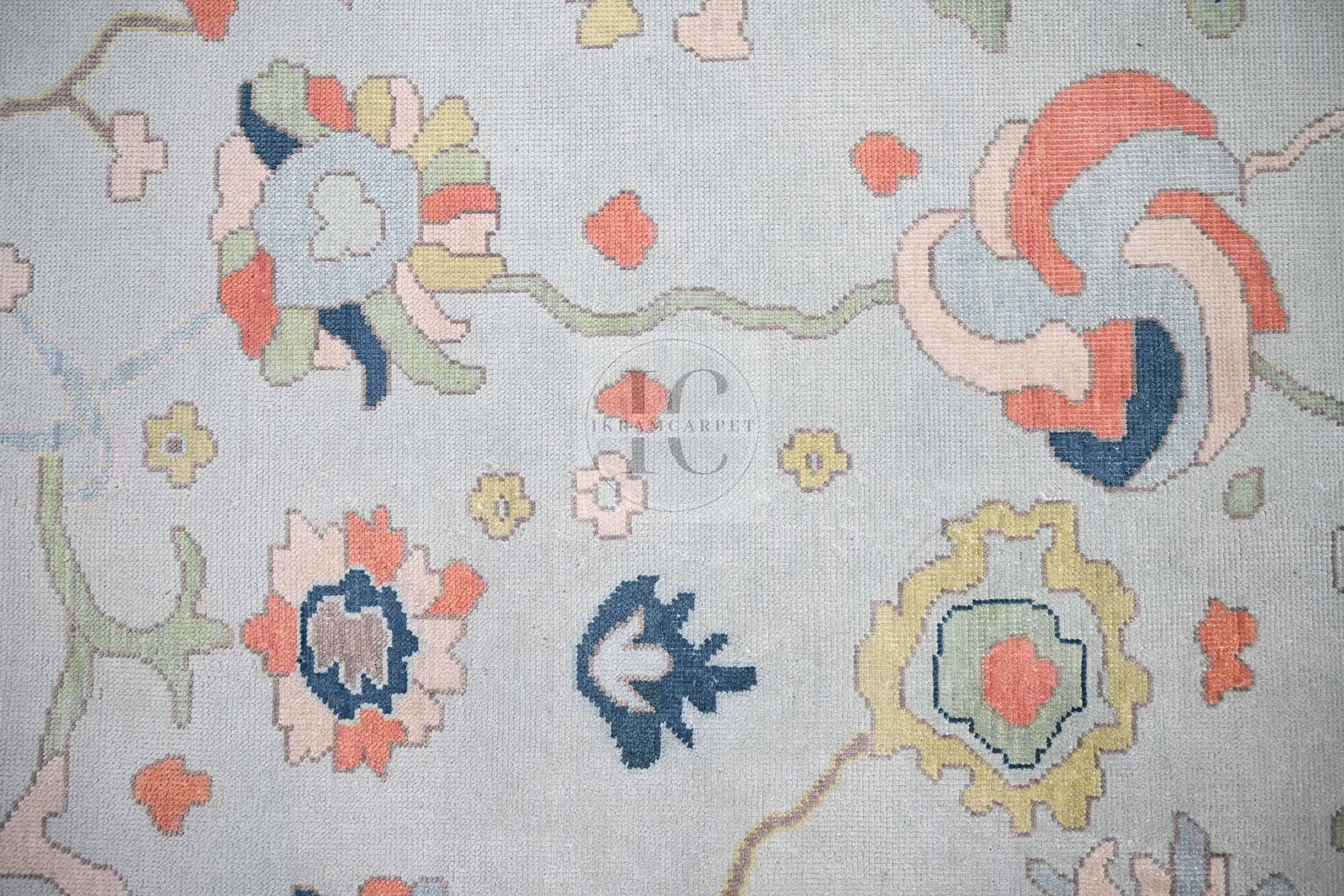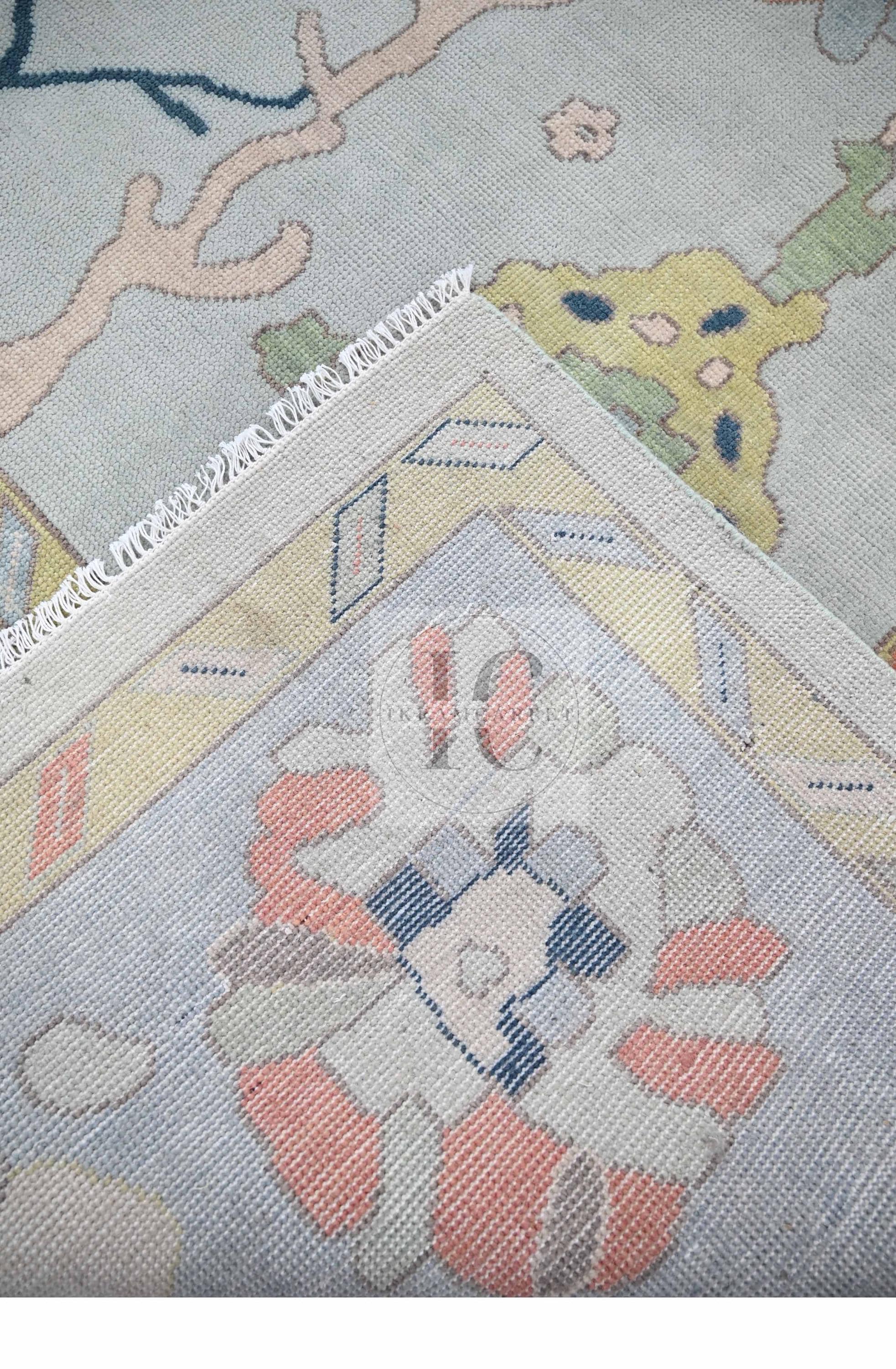 Hand-knotted Turkish Oushak rug in light gray, coral, soft yellow, light blue, and beige tones β€” available in 9x12 and all custom sizes. Crafted from premium New Zealand wool, this rug offers vibrant artistry with timeless charm, making it a statement piece for modern and classic interiors.